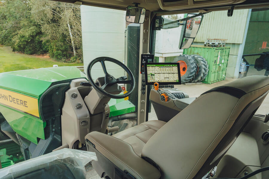 Switchgear is a mix of very big physical buttons and some touchscreen controls, with a lot of commonality with other John Deere tractors, such as a display screen mounted to the A-pillar to keep an eye on the tractor’s own mechanical systems. A larger screen mounted to the right-hand armrest/control console (a 5G ‘CommandCenter) tends to deal more with implement-pulling info and controls.